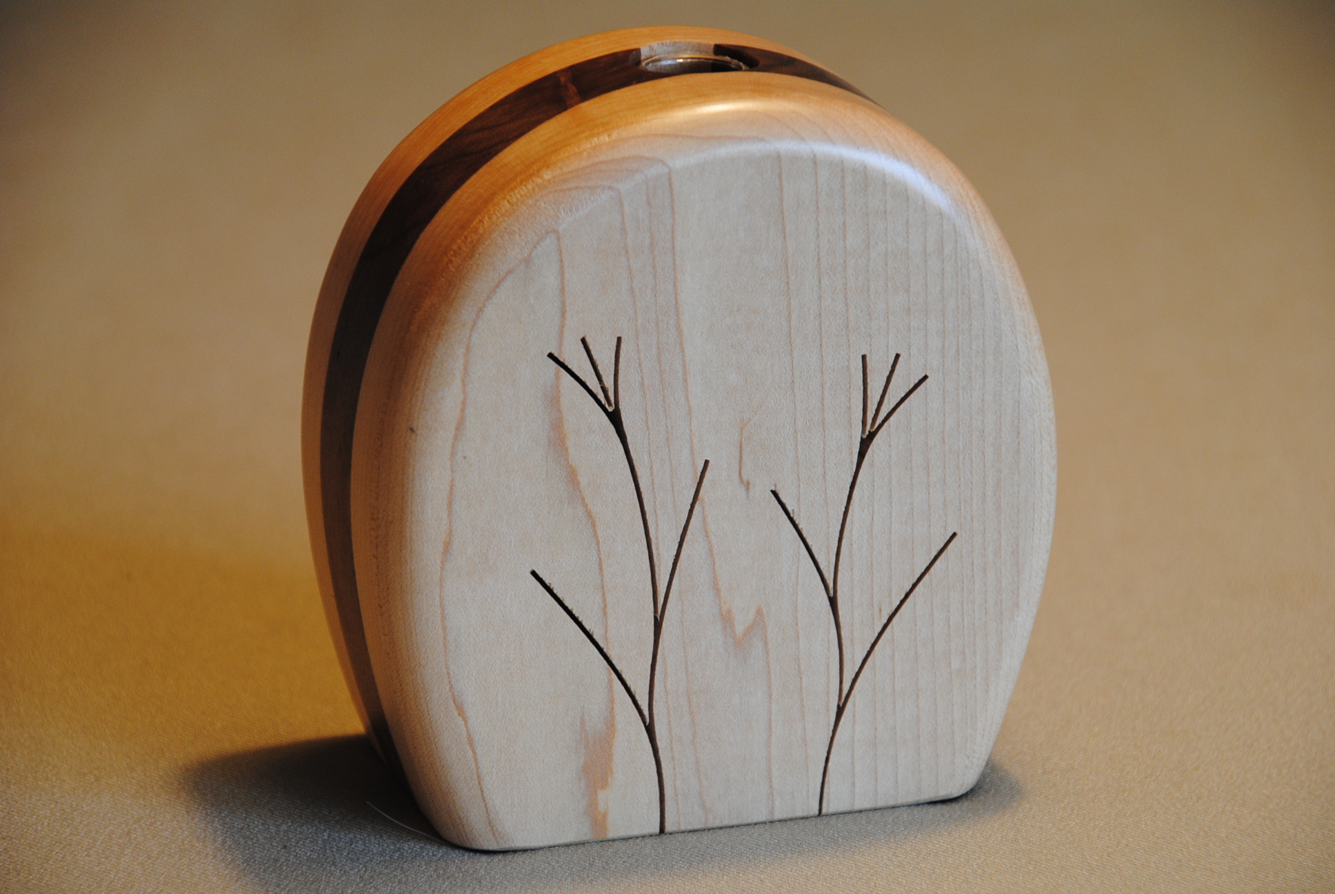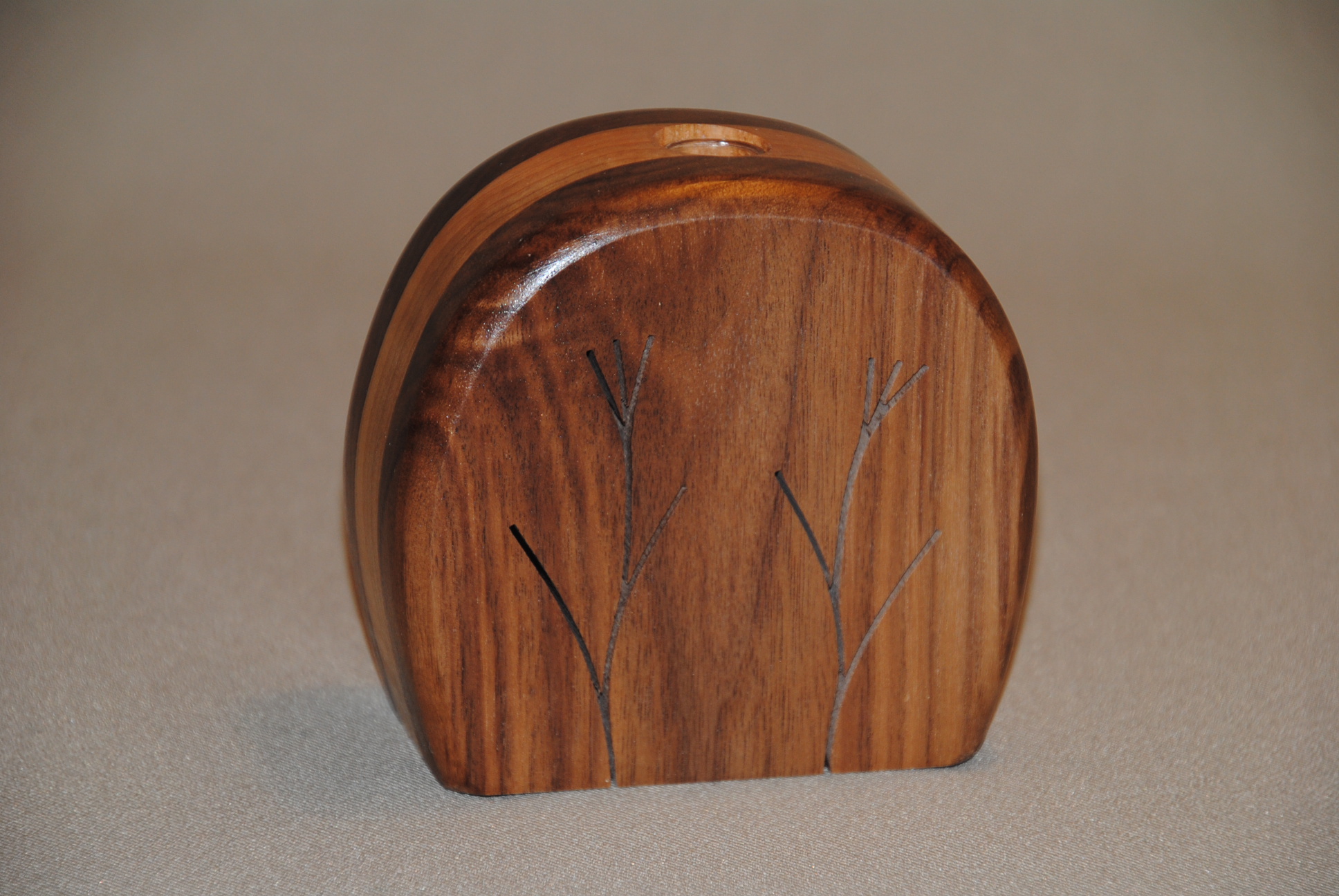 The round top vases shown below are offered in either a walnut, maple or cherry outside wood. Each measures 5 inches high, 5 inches wide, and 2 1/2 inches deep. The simple band-saw design can be seen on both outside pieces, and each has a removable plastic tube. Felt dots on the bottom prevent table scratches.