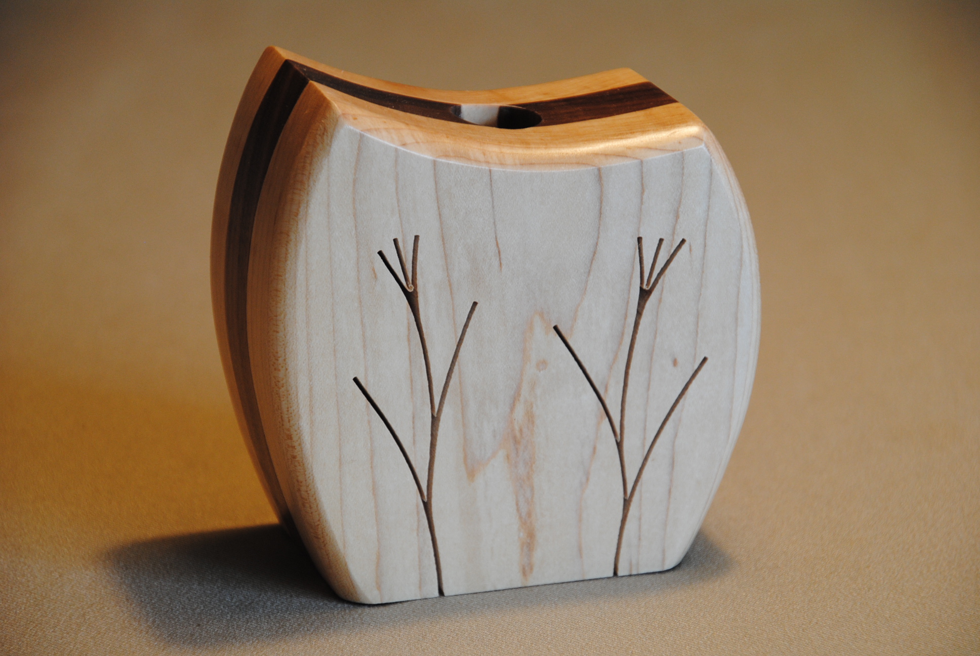 The scoop top vases shown below are offered in either a walnut, maple or cherry outside wood. Each measures 5 inches high, 5 inches wide, and 2 1/2 inches deep. The simple band-saw design can be seen on both outside pieces, and each has a removable plastic tube. Felt dots on the bottom prevent table scratches.