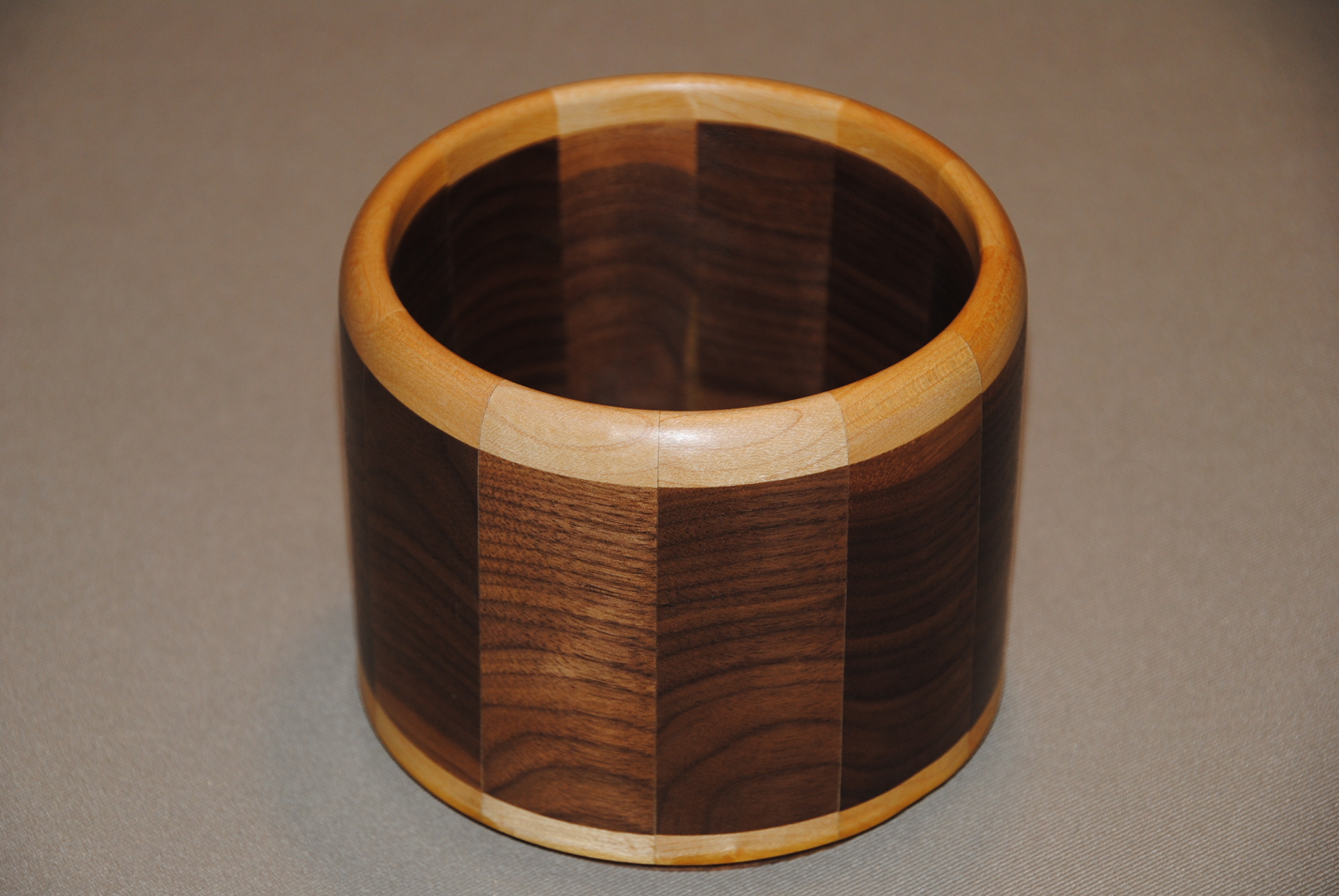 Our smaller bowls are approximately 6 inches in diameter and 3 1/2 inches high. They are constructed in much the same way as our larger bowls except that the middle surface is all the same wood. As a contrast, "rings" of contrasting wood circle the top and bottom. Please remember these are one-of-a-kind bowls and therefore multiple orders are not possible.